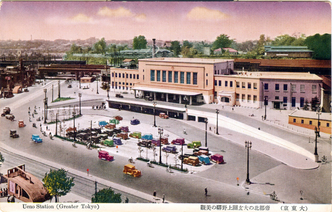 Ueno Station, c. 1930, with Ueno Park in the distance. Lower-left is a subway entrance leading to the Ginza Line, Tokyo’s first subway, completed in 1927.