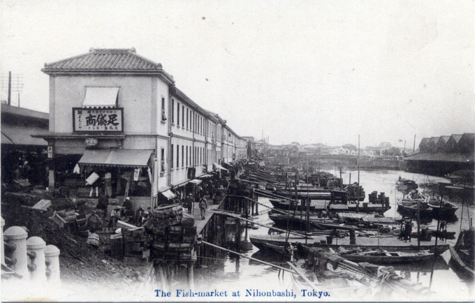 The Fish-market (Uogashi) at Nihonbashi, Tokyo, c. 1910. The market has its beginnings during the Tokugawa era and remained in the Nihonbashi until it had far outgrown its usefullness there and, precipitated by damage from the 1923 Great Kanto Earthquake, was relocated to the larger confines of the former foreign settlement at Tsukiji.