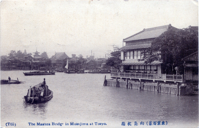 Yaomatsu restaurant (right), across from Asakusa, at the Makurabashi ferry crossing, c. 1910. The large, broad roof of Asakusa Sensoji (Asakusa Kannon) can be seen in the distance.