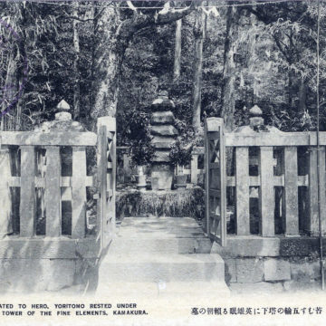 “The tomb dedicated to hero, Yoritomo, rested under the old tower of the fine elements,” Kamakura, c. 1930.