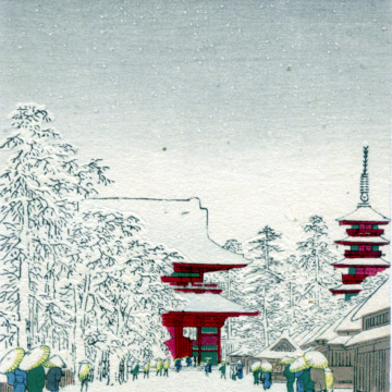 Postcard reproduction (partial) of Hiroshige’s “Kinryūzan Temple in Asakusa”, Tokyo, c. 1940.