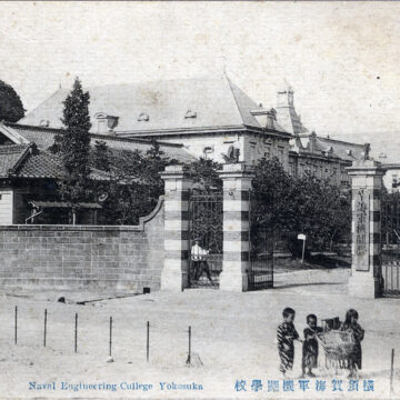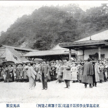High school class excurision to the Miura peninsula in line outside Zushi Station, Zushi, c. 1910.