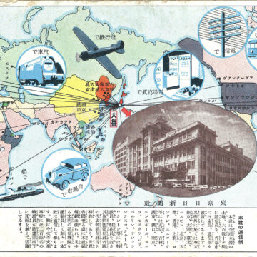 ““Domestic and International Communications Network” advertising postcard, Tokyo Nichi Nichi Shimbun, Tokyo, c. 1940.