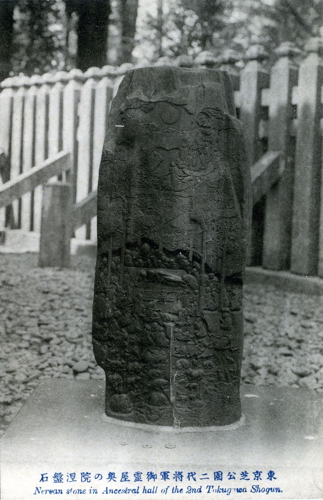 “… Inside the shrine are an effigy of Hidetada and his funeral tablet (i-hai), the body being below the pavement. It is said to have been buried in a mixture of vermilion and charcoal powder to preserve it from decay. Outside this building are two curiously carved stones dating from 1644, the subject of one being the Entry into Nirvana or Death of Shaka [Sakyamuni], and of the other the five-and-twenty Budhisattvas coming with Amitubha (Anjida) to welcome the departed soul.”