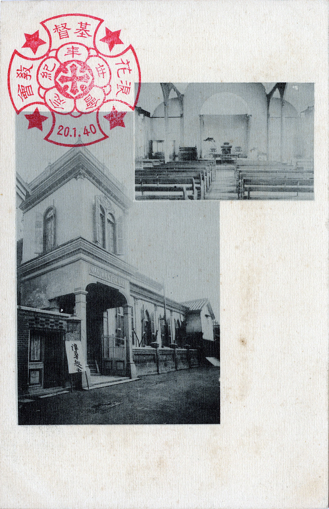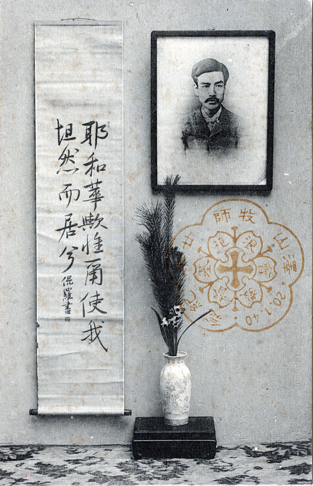 30th Anniversary of the Naniwa (Osaka) Christ Church commemorative postcard, 1907, picturing a reverent tokonoma display celebrating the life of Paul Sawayama (1851-1887), founding pastor of Naniwa Christ Church. Sawayama and his contemporary, Joseph Neesima, founder of Doshisha University, were considered two of the most influential Protestants among early post-Restoration Japanese Christian converts.