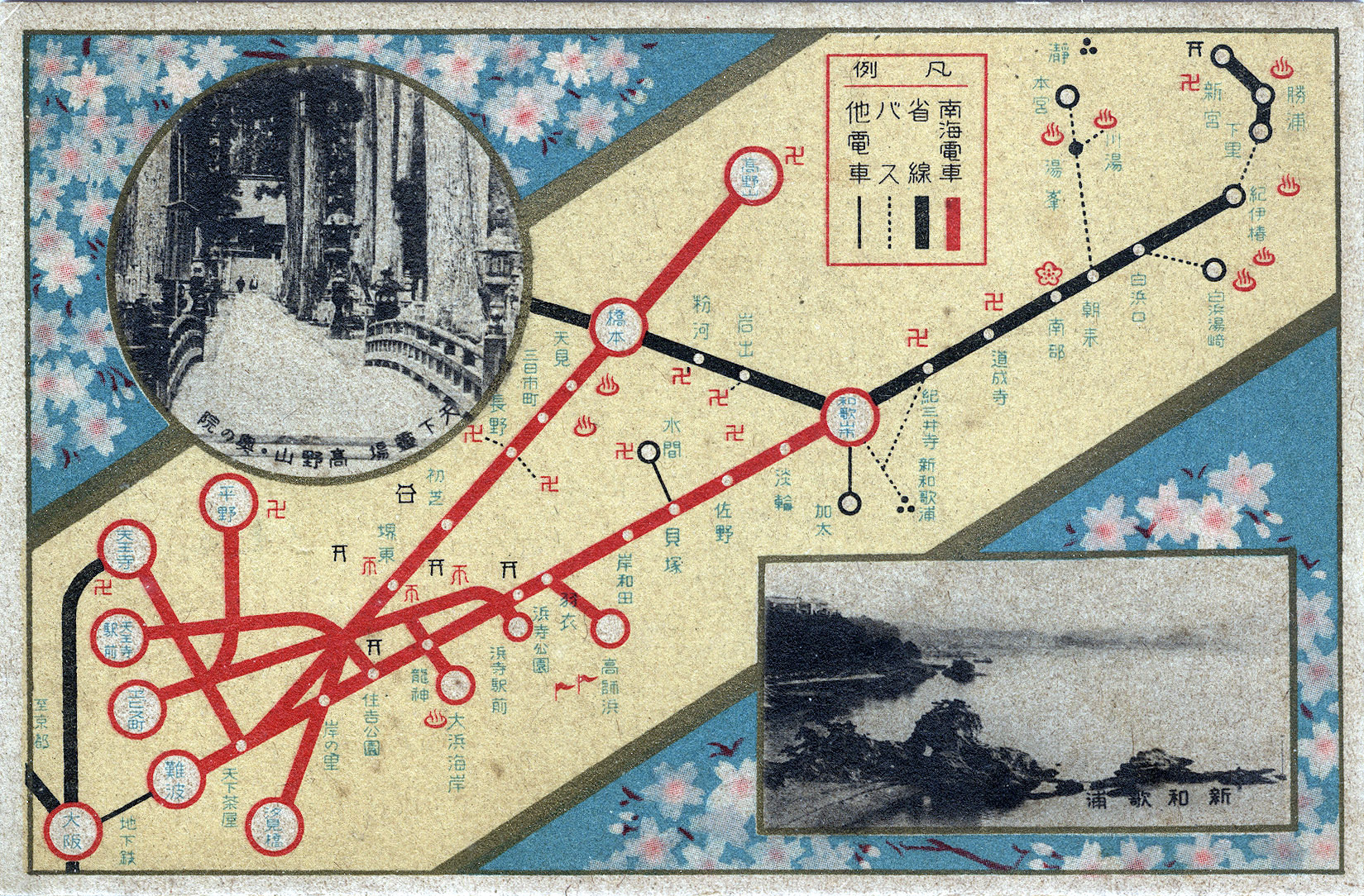 - 50th Anniversary commemorative postcard, Nankai Railway Co., Osaka, 1934. Osaka Station is at lower-left; Wakayama Station is at right-center, with service line extension (in black) to onsen and temple tourist sites.