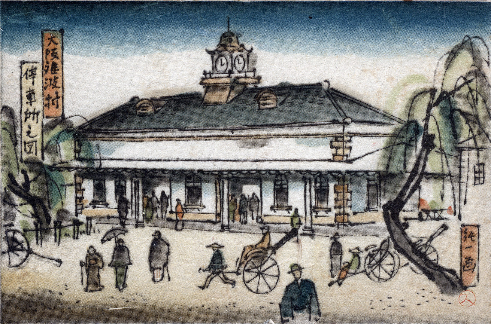 - Postcard reproduction of a pen and watercolor illustration of Osaka Namba Station, 50th Anniversary commemorative postcard, Nankai Railway Co., Osaka, 1934.