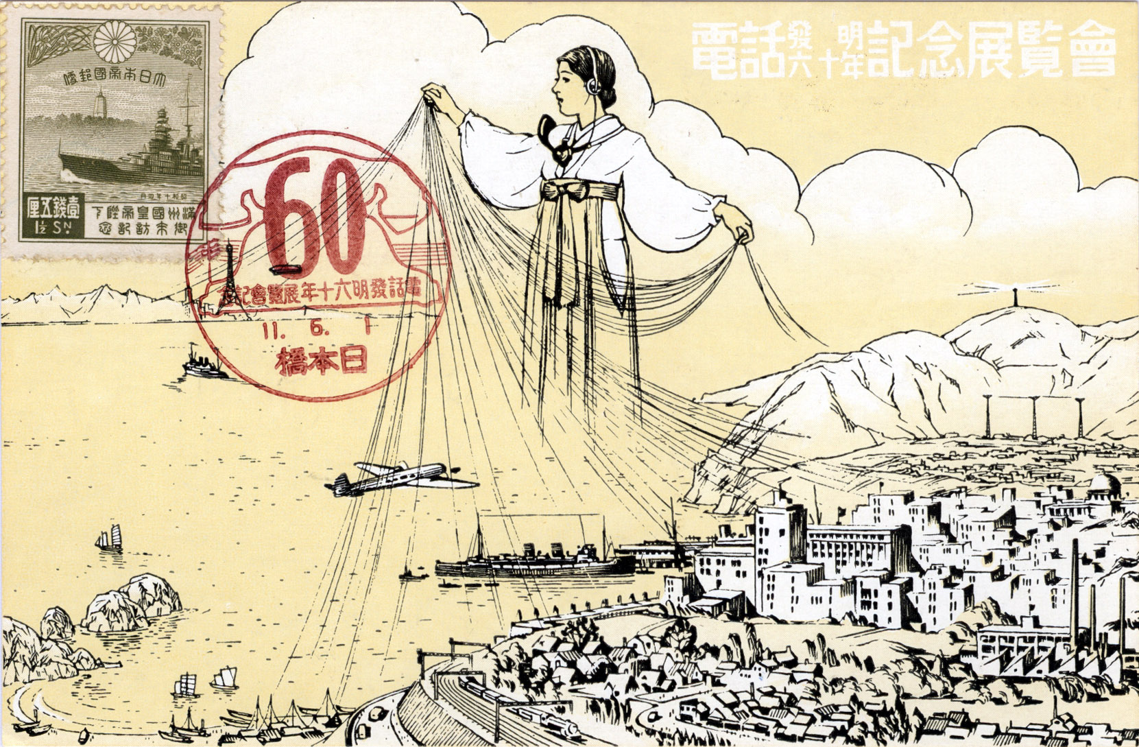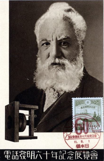 “Exhibition to Commemorate the 60th Anniversary of the Invention of the Telephone”, 1936. Telephone service was first introduced to Japan in 1877, when Alexander Graham Bell personally visited Japan a year after its invention to demonstrate his apparatus. The first telephones were found in governmental ministries and several Tokyo police stations. However, the service suffered from many complications and poor reception. In 1890, the government created a national corporation, and the improved system was extended to many post offices where private citizens were able to make calls. It was not until the late 1920s that telephones began to appear in middle-class homes.