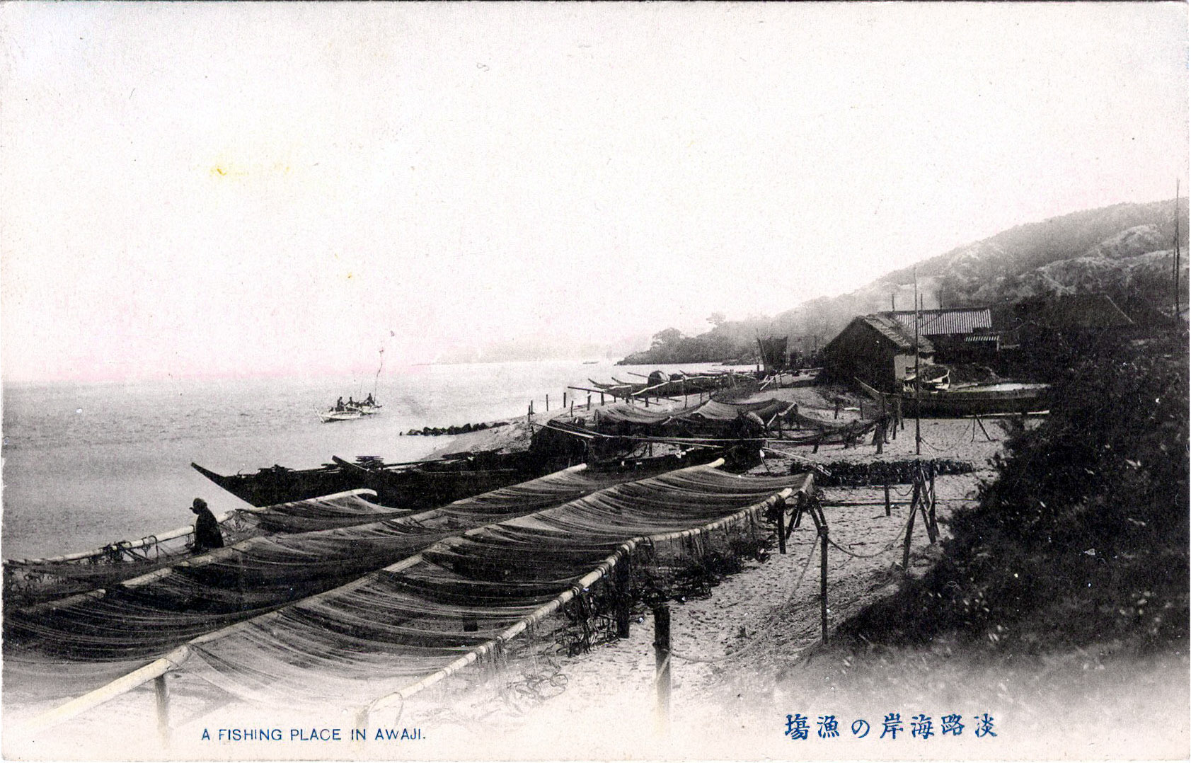 “A fishing place in Awaji”, Hyogo Prefecture, c. 1920. (The Japanese caption translates to “The shore and sea of the fishing grounds.”) According to the Shinto creation myth Awaji was the first of the ōyashima islands [the eight islands that constitute Japan] born by the two kami, Izanagi and Izanami who gave earth its solid form. Awaji constituted its own province between the 7th-19th centuries. After the Restoration, Awaji was incorporated into Hyogo Prefecture of the Kansai region. In the present day, Awaji island is connected to Honshū island by the Akashi Kaikyō Bridge, the longest suspension bridge in the world.