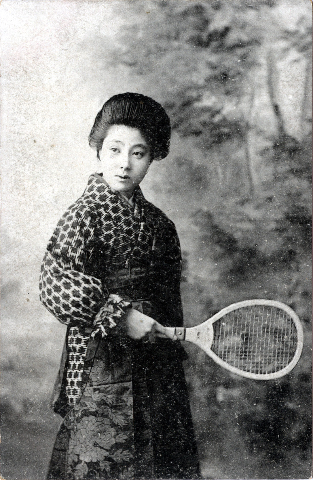 Onnanoko with tennis racket, c. 1920. In 1920, a Japanese tennis team first participated in a Summer Olympics. The Japan Tennis Association was formally established in 1922.