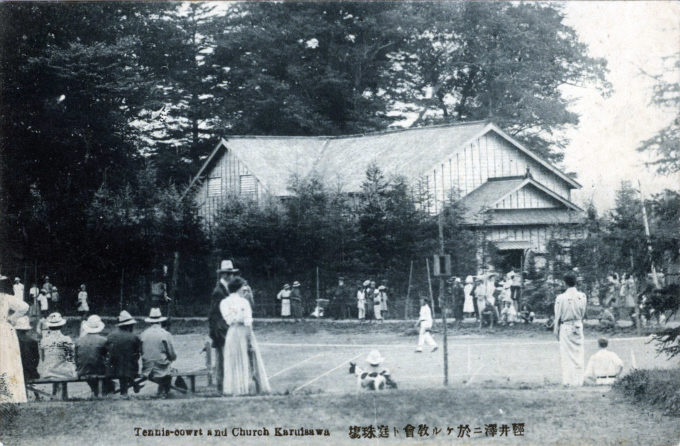 “Tennis-cowrt [sic] and Church”, Karuizawa, c. 1920. The tennis courts astride Karuizawa Union Church.