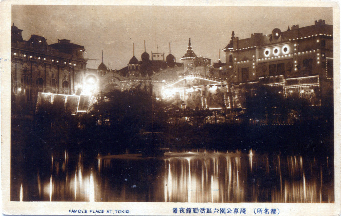 “[I]n an unfinished novel, The Mermaid (Kojin), Tanizaki tells what Asakusa was like in 1918. Its attractions were ‘plays of the old style, operettas, plays in the new style, comedies, movies – movies from the West and Japanese productions, Douglas Fairbanks and Onoe Matsunosuke – acrobats balancing on balls, bareback riders, Naniwa bushi singers, girl gadayu chanters, the merry-go-round, the Hanayashiki Amusement Park, the Twelve Story Tower, shooting galleries, whores, Japanese restaurants, Chinese restaurants, and Western restaurants – the Rairaiken, won ton mein, oysters over rice, horsemeat, snapping turtles, eels, and the Café Paulista.'”