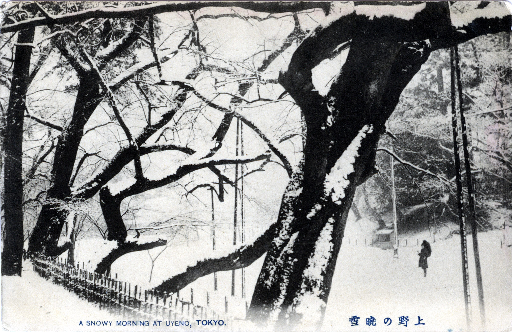 “A snowy morning at Uyeno,” Tokyo, c. 1920. An umbrella-toting visitor (lower right) enjoys the serenity of the winter snow of Ueno Park.