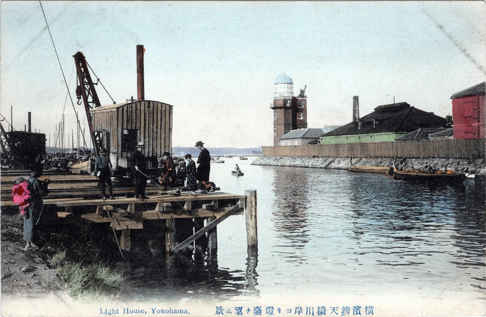 “A view of a lighthouse from the Bentenbashi riverbank”, Yokohama, c. 1910. The history of Japanese lighthouses goes back 1200 years beginning, it is said, with signal fires (‘noroshi‘) lit in the daytime and bonfires (/kagaribi‘) burning at night along the capes of Kyushu. Modern-era lighthouses, using polished lenses and hollow wick lamps, first appeared on the Japanese coast in 1869, with the first thirteen built to light the approaches to newly-opened treaty ports.