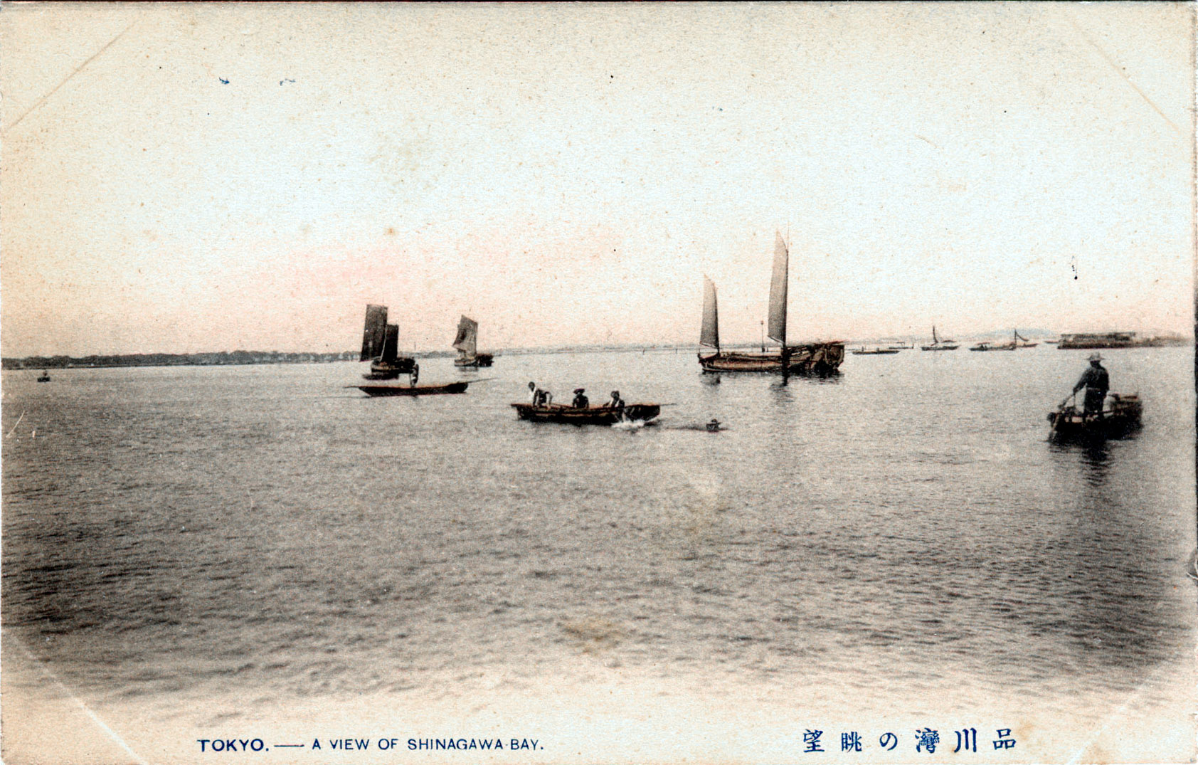 A View of Shinagawa Bay, c. 1910. Prior to the Meiji Restoration, Shinagawa was a post station on the Tokaido highway. Up through the Meiji and Taisho eras, the largely rural town still remained outside the Tokyo city limits until the 1930s when it was incorporated as one of the city’s new wards. Beneath its present modern-day skyscraper facade, Shinagawa still retains its roots as a transportation hub – 15 different overland and underground rail lines converge there.