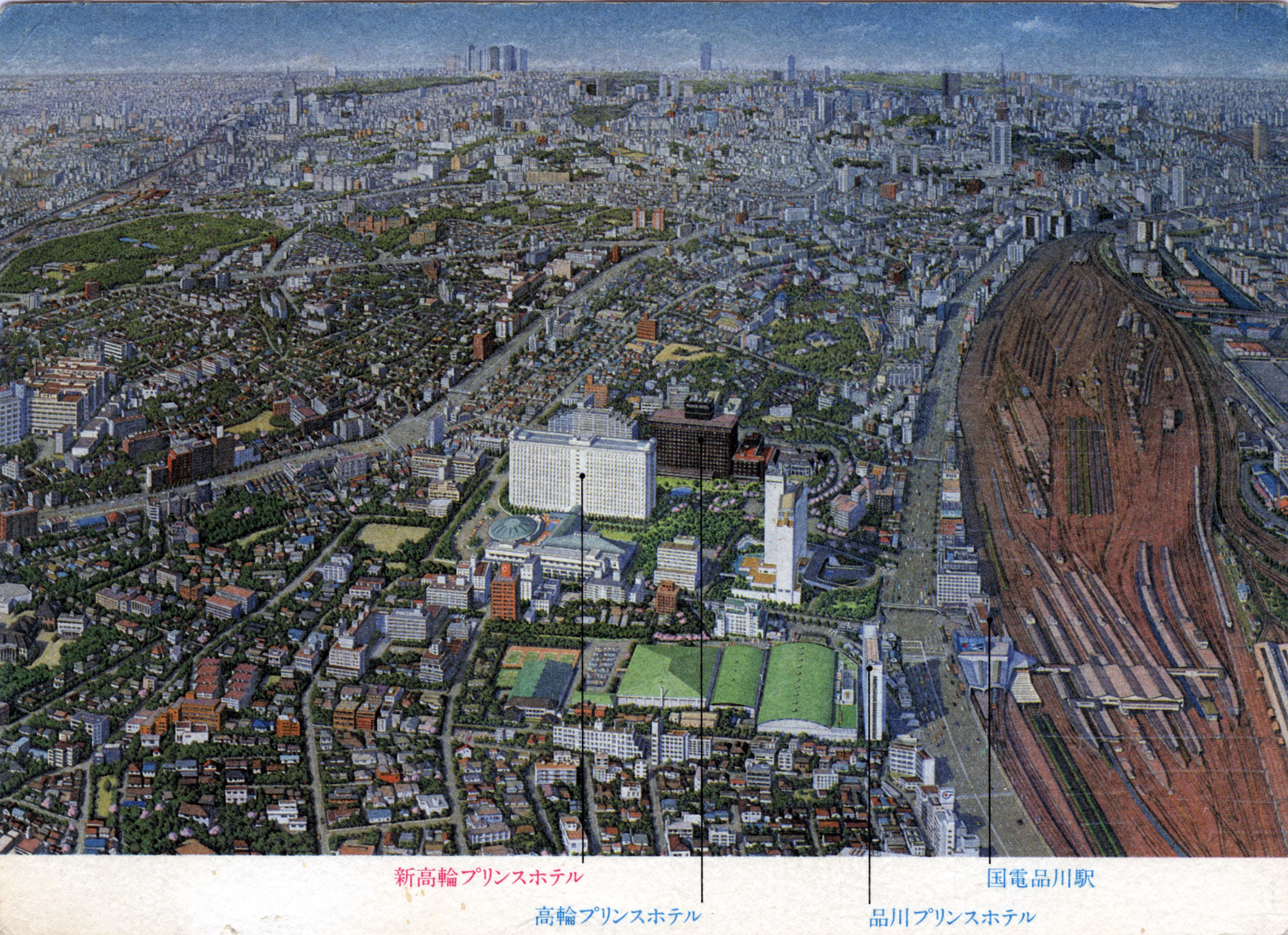 Aerial view of Shinagawa Station (right) and environs, c. 1980. The three highlighted building are (left to right): New Takanawa Prince Hotel, Takanawa Grand Prince Hotel, and Shinagawa Prince Hotel. Two of the three hotels are effectively managed as one, and are situated in a 10-acre garden which formerly belonged to Prince Tsuneyoshi Takeda, a member of the Imperial family. Note the large rail yard at right. Shinagawa grew rapidly from a feudal post station to a modern industrial city with the development of rail transport during the Meiji and Taisho periods. Much of Shinagawa was destroyed by firebombings during the Pacific War, but the district was quick to achieve postwar recovery. SONY established its corporate headquarters in Shinagawa after its founding in the 1950s (before moving to nearby Minato-ku in 2006); Japan Air Lines (JAL) is headquartered in Shinagawa, as is Bandai Games, Fuji Electric, Seimens Japan, and MOS Burgers.