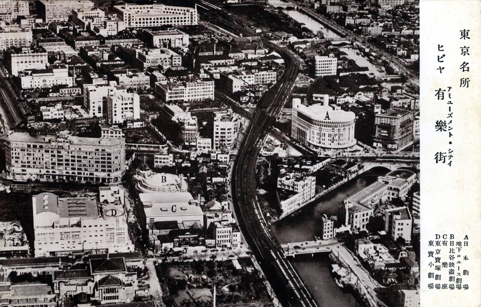 In the image above, the three new theaters were clustered together near the Imperial Hotel (partially visible at lower-left), including the (B) Hibiya Eiga Gekijo, (C) Yurakuza Theater, and the (D) Toho (aka Takarazuka) Gekijo – all three within easy walking distance of Yurakucho Station near the rival 4000-seat (A) Nichigeki Theater.