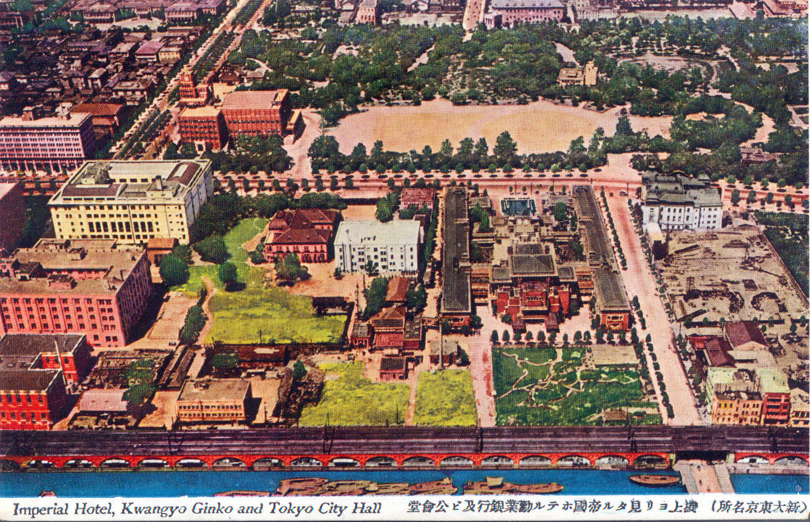 (Above:) 1. Asahi Shimbun (Newspaper); 2. Nichigeki Theater; 3. Imperial Theater; 4. Tokyo Kaikan; 5. Tokyo Metropolitan Office; 6. Marunouchi Building; 7. Kaijo Building; 8. Central Post Office; 9. Tamei Primary School; 10. Sukiyabashi Bridge.