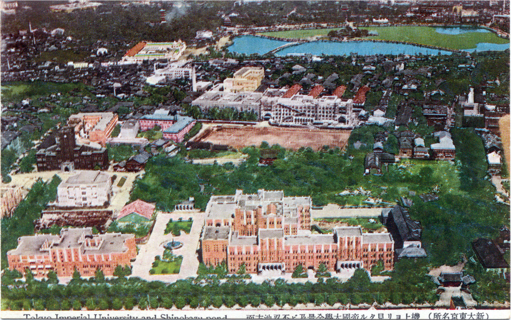 - H. Aerial view of Tokyo Imperial University and Shinobazu Pond, Ueno, c. 1940.