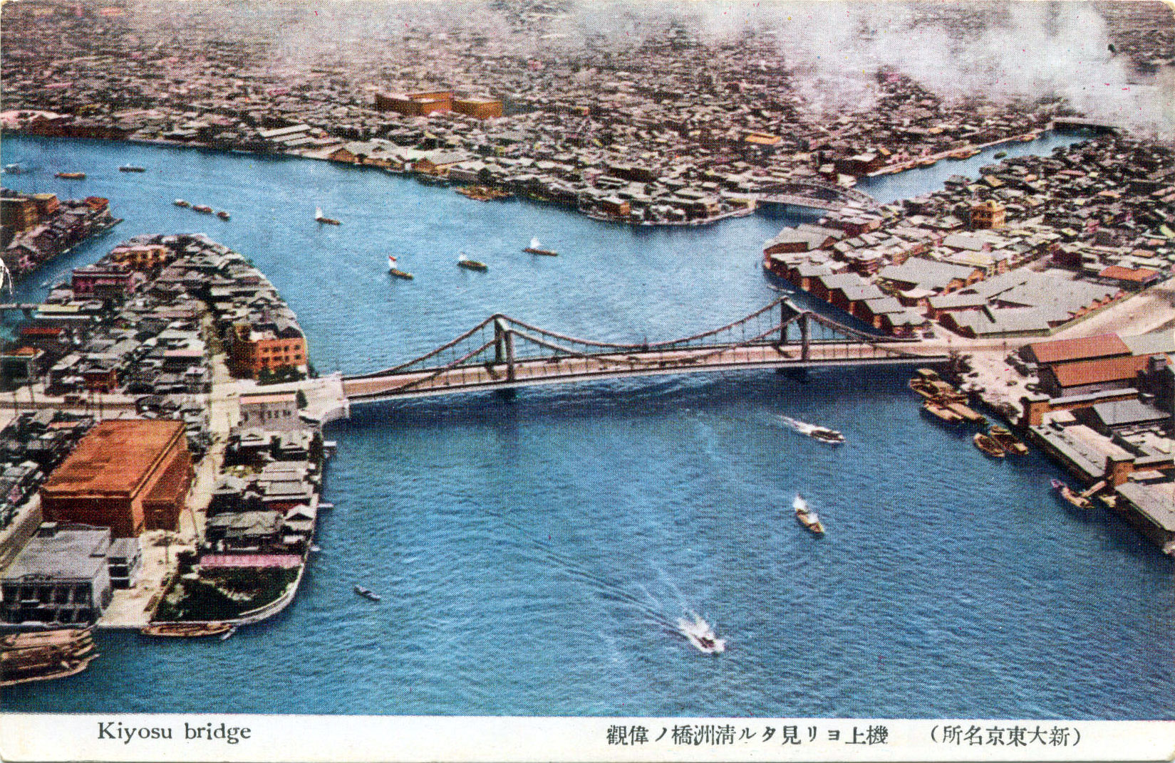 - Kiyosu-bashi aerial view, spanning the Sumida river, c. 1940.