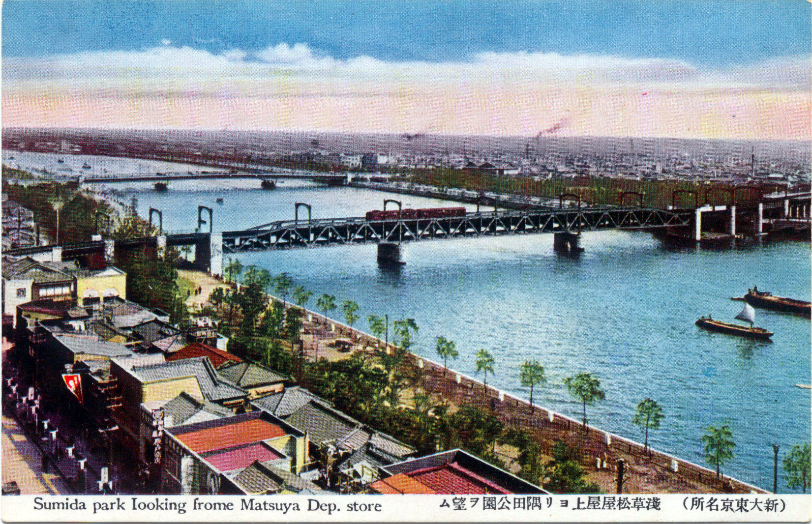 - M. Tobu railway bridge (foreground) and Kototoi-bashi at Sumida river park, near Asakusa, c. 1940.