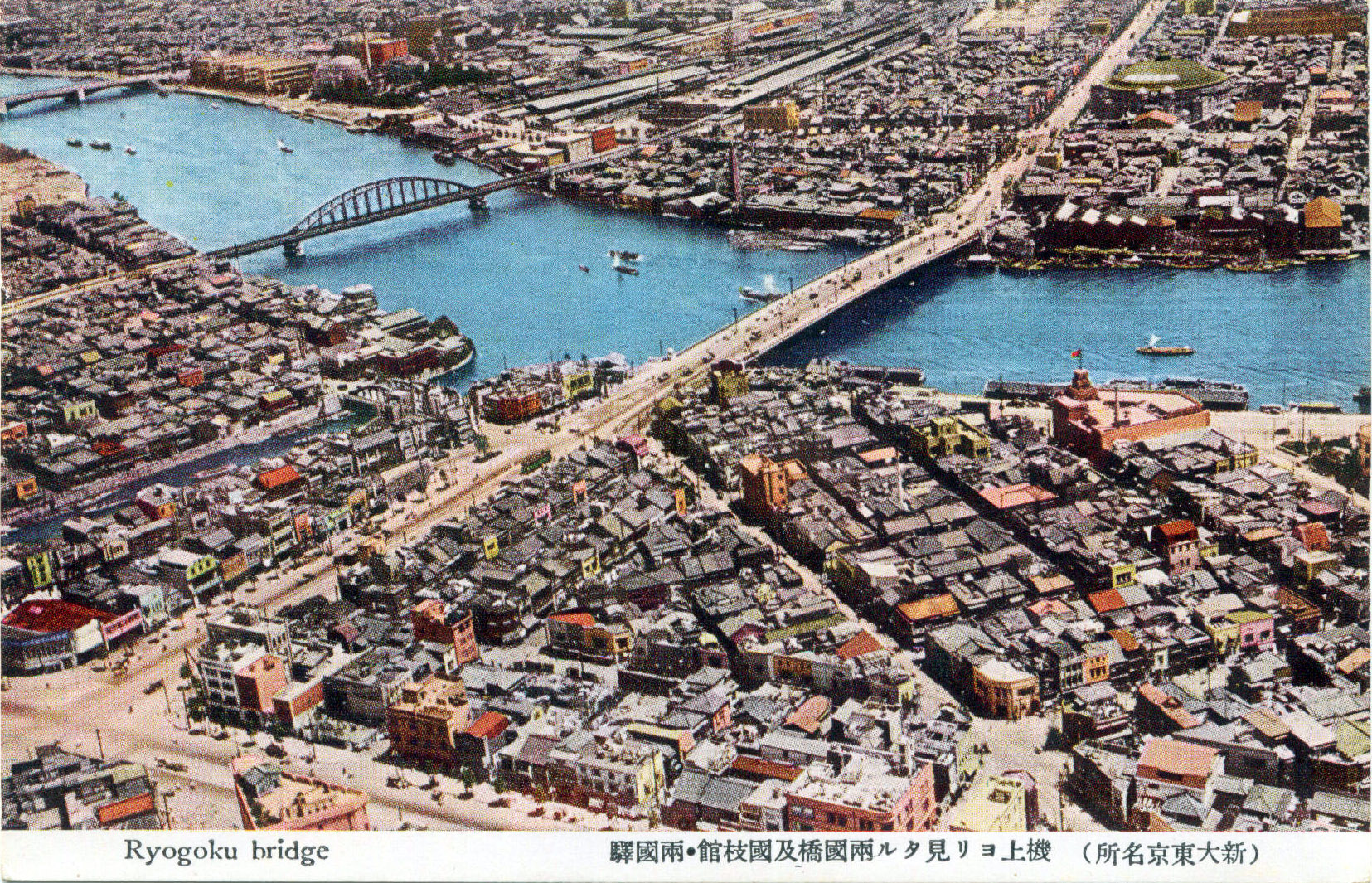 - N. Aerial view of Ryogoku-bashi (center) spanning the Sumida river and, in the upper right, the Kokugikan sumo hall, c. 1940.
