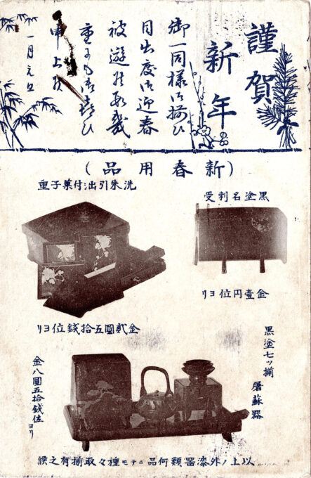 “New Year’s Supplies of the Imperial Fifth-Rank Style”. Aizuya Honten Lacquerware Wholesaler, New Year’s advertising postcard, Nihonbashi, Tokyo, c. 1905. Early use of collotype for photo reproductions. Among the items displayed are (clockwise from top-left) a lacquered confectionary case, lacquered presentation tray (for calling cards), and a black-lacquered seven-piece tea set.