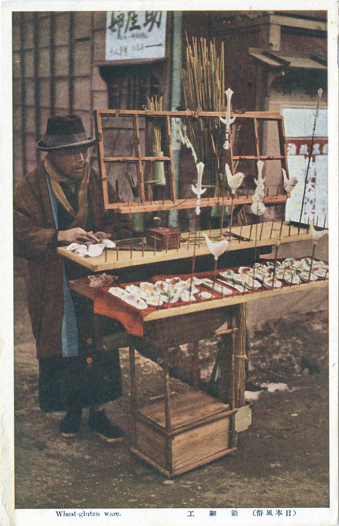 Amezaiku [sugar sculpture; 飴細工, lit. slender candy worker] street vendor, c. 1930. Amezaiku are created using mizuame, a sugar syrup made from rice or potato starch, similar to corn syrup. The candy base is prepared beforehand, kneaded and formed into a large ball. At the stall, the artist reheats it to make the mizuame pliable for sculpting. Some amezaiku artists are also street performers who perform magic tricks and tell stories along with their candy crafting entertainment.