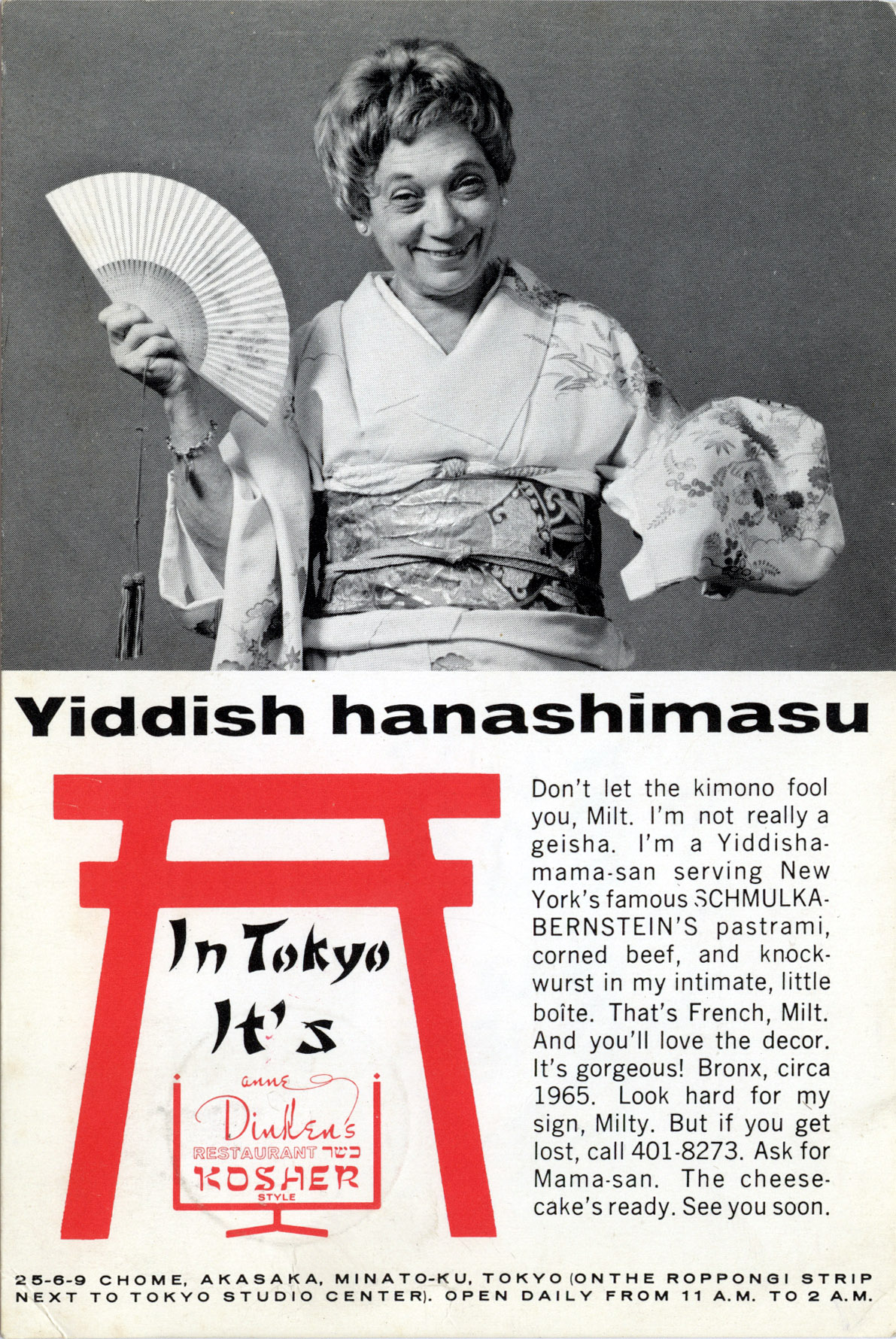 “I’m not really a geisha. I’m a Yiddisha-mama-san.” Advertising postcard for Anne Dinken’s Kosher Restaurant, Tokyo, c. 1970. “Yiddish Hanashimasu” is translated to “Yiddish spoken here.”