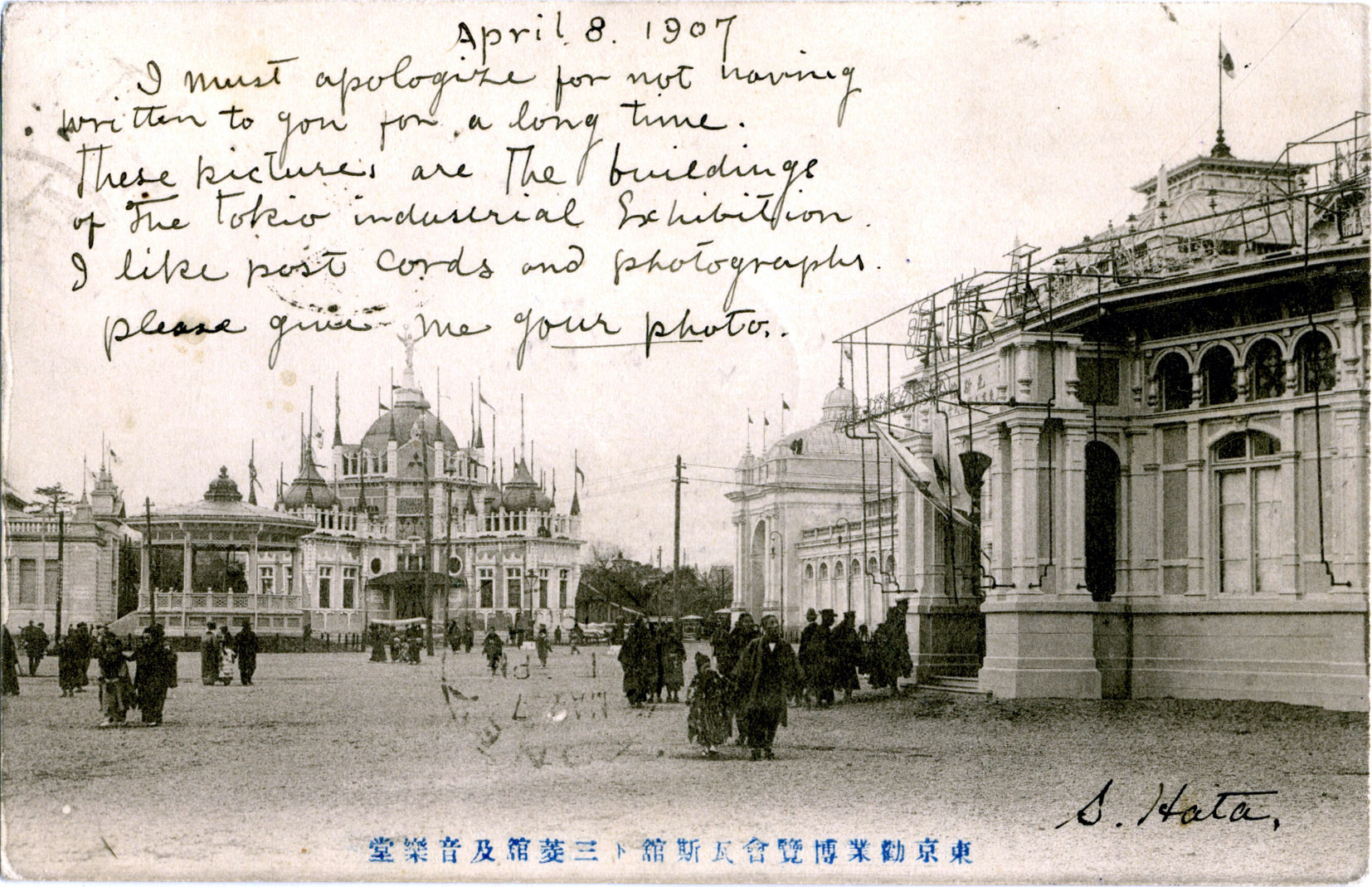 “I must apologize for not having written to you for a long time. These pictures are the buildings of the Tokio Industrial Exhibition. I like postcards and photographs. Please give me your photo. S. Hata”