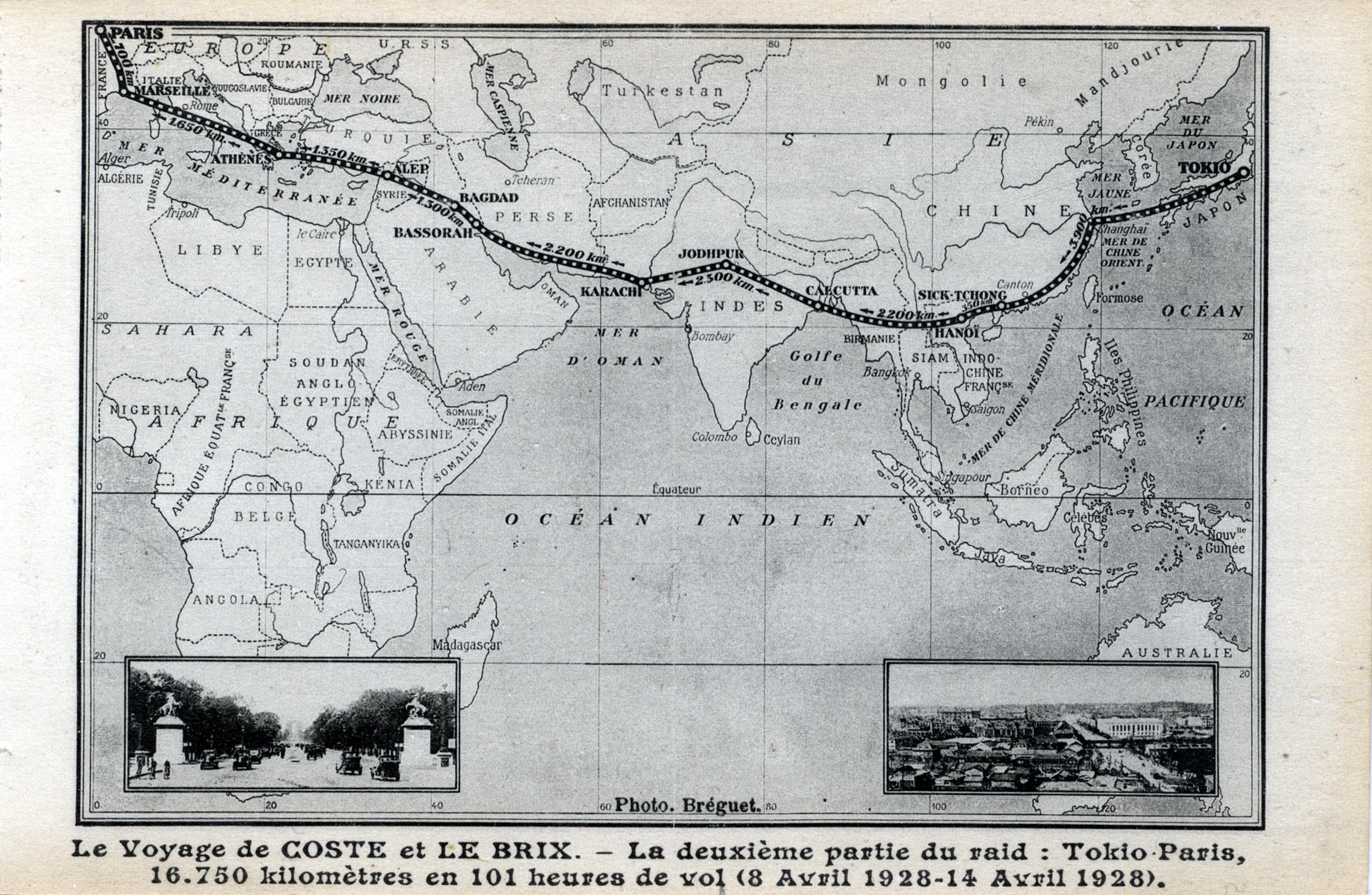 “Despite their growing dislike for one another, the two men pushed on, flying across the United States to San Francisco, California. There they boarded a ship to cross the Pacific Ocean by sea. Arriving in Tokyo, Japan, they resumed their flight, stopping in French Indochina, India, French Syria, and Greece before completing their trip with an arrival before an enthusiastic crowd at Paris–Le Bourget Airport in Paris on 14 April 1928. The trip had covered 57,410 kilometers (35,652 miles) by air in 338 flight hours over 187 days with 43 stops. Le Brix’s relationship with Costes was ruined, however; upon arrival at Paris–Le Bourget, Le Brix supposedly said sharply, ‘Finally I am no longer the servant of Costes.’