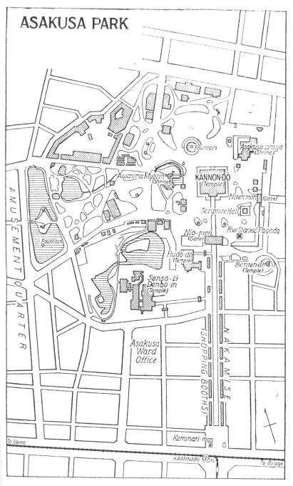 Map: Asakusa Park, showing Nakamise, the temple grounds, Hanayashiki, and the Rokku (Theater Street) amusement quarter. (From Japan: The Pocket Guide, Japan Travel Bureau, 1946.)