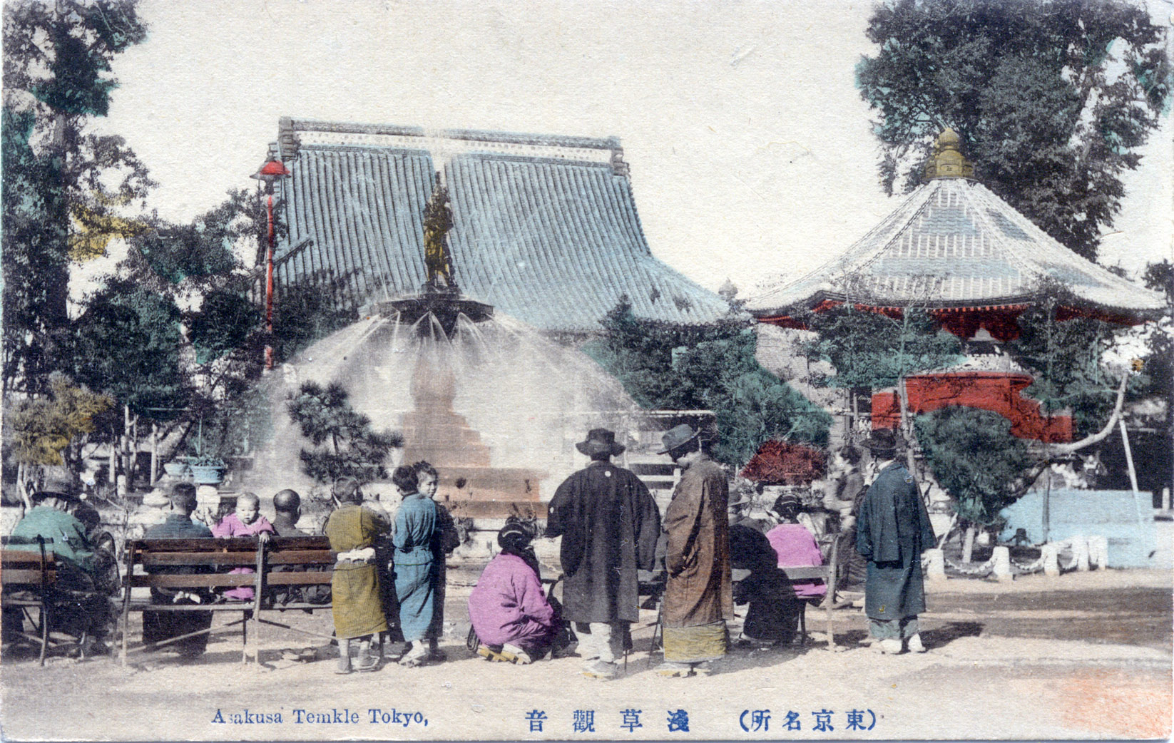 “On no account should a visit to [the Asakusa Kannon] and surrounding grounds be omitted; for it is a great holiday resort of the middle and lower classes, and nothing is more striking than the juxtaposition of piety and pleasure, of gorgeous altars and grotesque ex-votos, of dainty costumes and dingy idols, the clatter of clogs, cocks and hens and pigeons strutting about among the worshippers, children playing, soldiers smoking, believer chaffering with dealers of charms, ancient art, modern advertisements – in fine, a spectacle than which surely nothing more motley was ever witnessed within the precincts of a religious edifice.