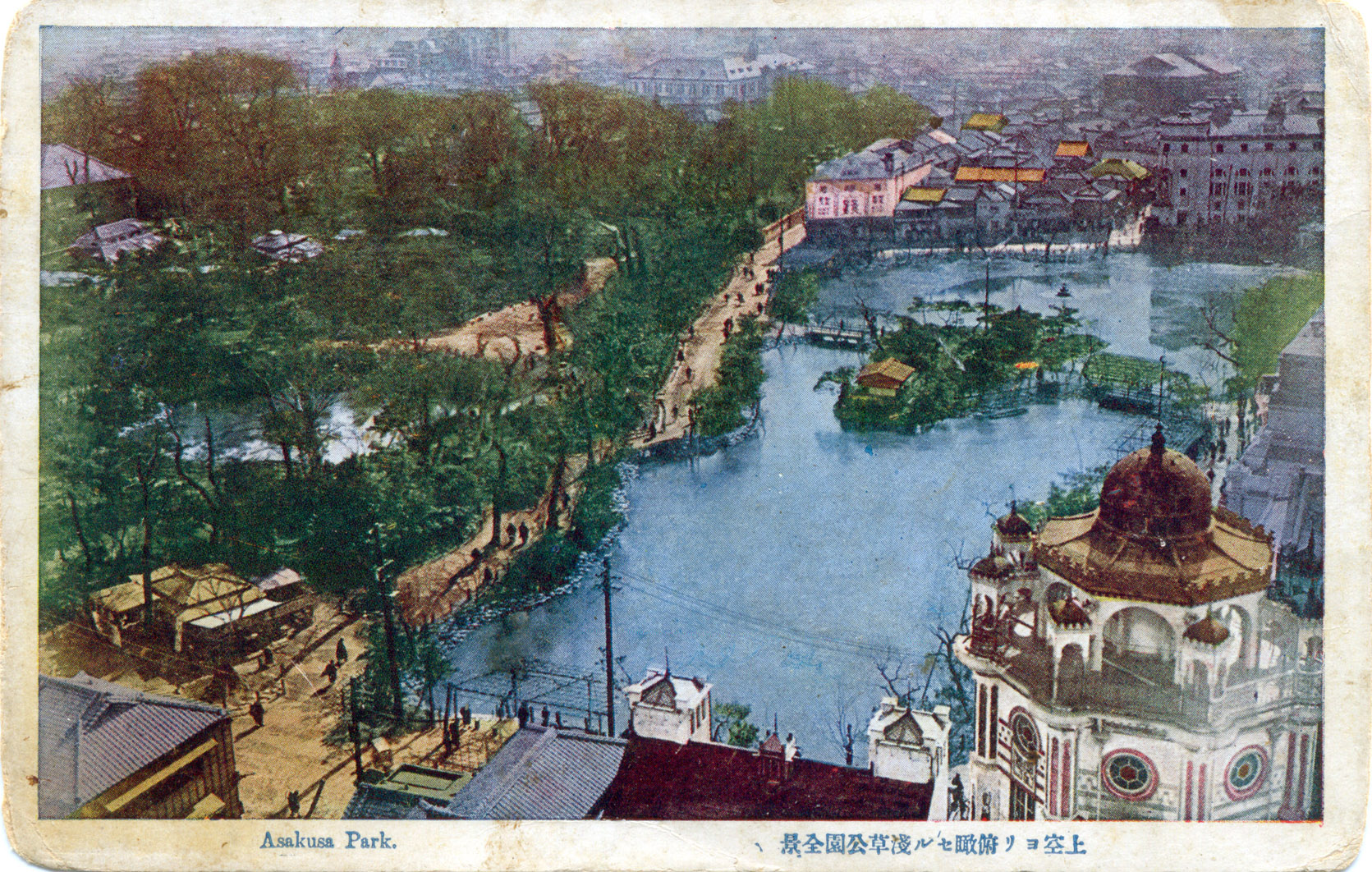 By design or otherwise, the 50-acre Asakusa Park acted as a buffer between the bawdy Rokku theater district and the pious, sedate religious grounds surrounding the Asakusa Kwannon. Early on, Asakusa Park was designated as one of Tokyo’s first five public parks (including Ueno, Shiba, Fukagawa-Kiyosumi, and Asakuyama), so established by the Meiji government in 1873 on appropriated temple grounds.