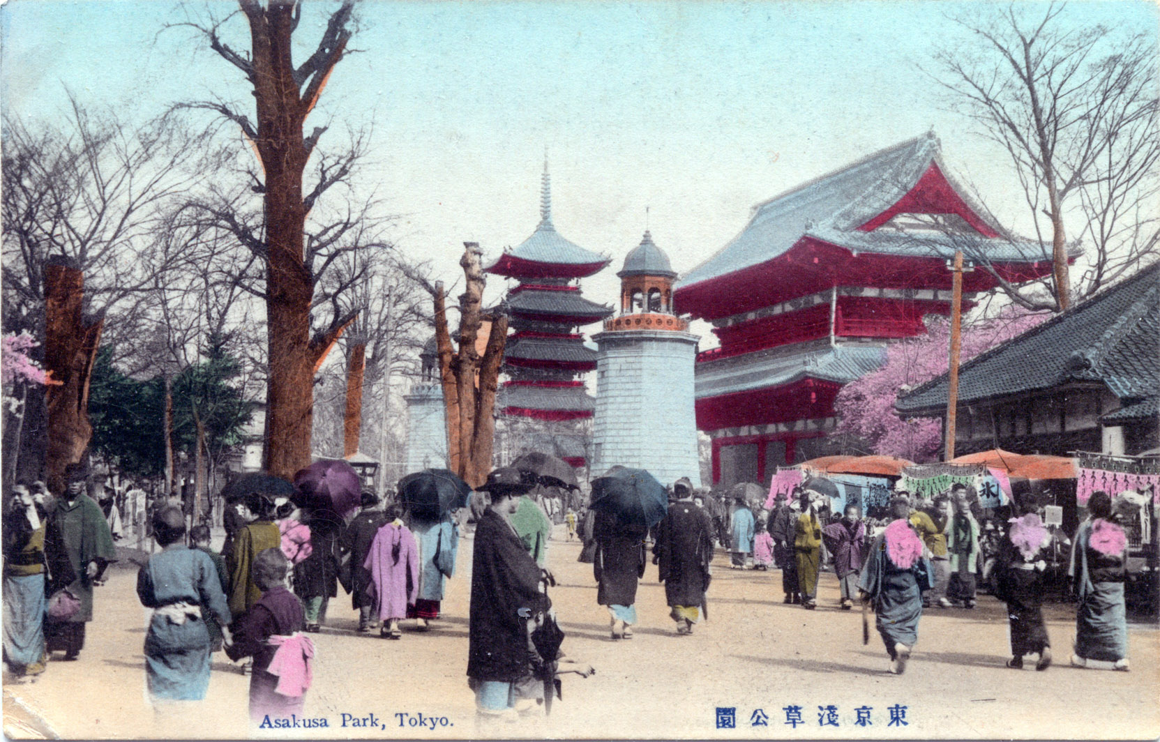 - Nio-mon Gate (right) and Five-Storied Pagoda, Asakusa, c. 1910. The Sensoji temple would be off to the left.