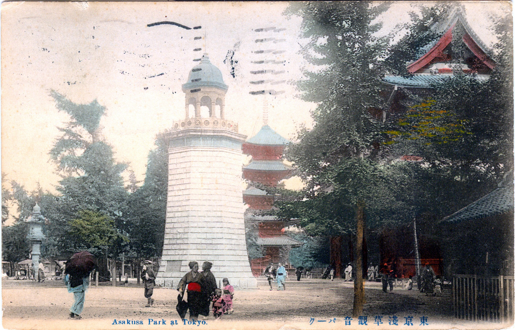 “Then you come to the park laid out in 1885 as a recreation ground for the people. On one side is the Hanayashiki, originally a flower garden but now much more of a zoo ,while over against the Hanayashiki is the fishpond teeming with goldfish, with a tea house and a bridge, and in summer an arbour of trailing Wistaria, beautiful to look upon. Beyond the lake on one side is the Aquarium; on the other the great Theatre Street with its row of Dime Shows where you can see a constant succession of feats of jugglery and acrobatic performances. Archery, which is always a favourite pastime with the Japanese, has a special corner for itself, and if you are fond of exercise you may climb to the top of the twelve-storied tower from which you can get a very comprehensive bird’s eye view of the whole city.