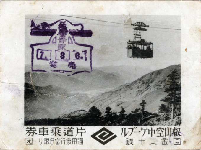 Map: Mt. Hiei Access. Eizan “Sky Cable” aerial cable car souvenir ticket reverse view (see below), Mt. Hiei, Kyoto, 1932, mapping access to the mountain trails leading to Enryakuji and other temple locations on Mt. Hiei itself/ The two rail cable routes up the mountain — Eizan in the west; Sakamoto in the east — provided mountain access in addition to the west face aerial cable car (“Sky Cable”).