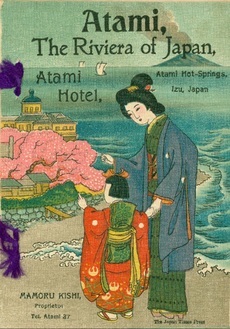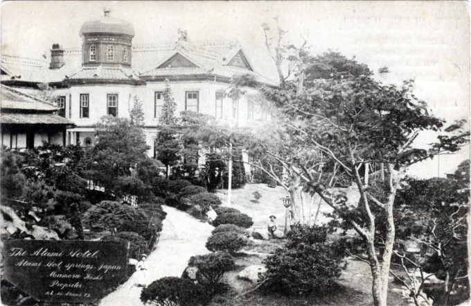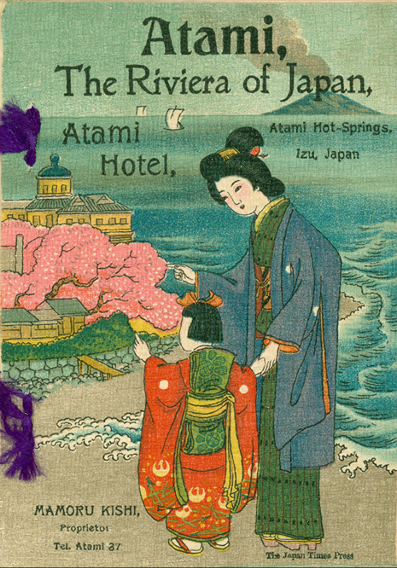 “Atami nestles cosily in a little V-shaped valley which reaches back into the hills from the sea and Sagami Bay, on the E. edge of the Izu Peninsula, in Izu Province. It is embowered in orange groves, camphor trees, and many flowers, which like the warm exposure and bloom riotously.