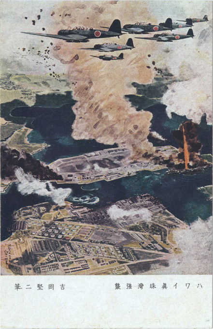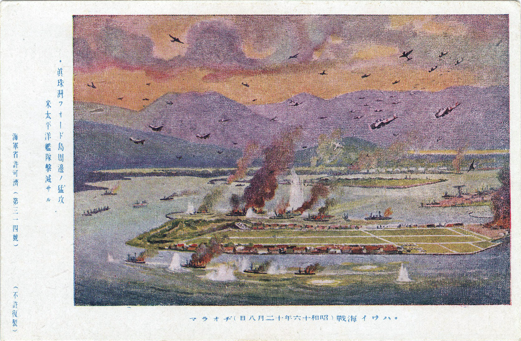 “The fierce attack around Ford Island”, Attack on Pearl Harbor propaganda postcard, c. 1942, published by the Ministry of the Navy.