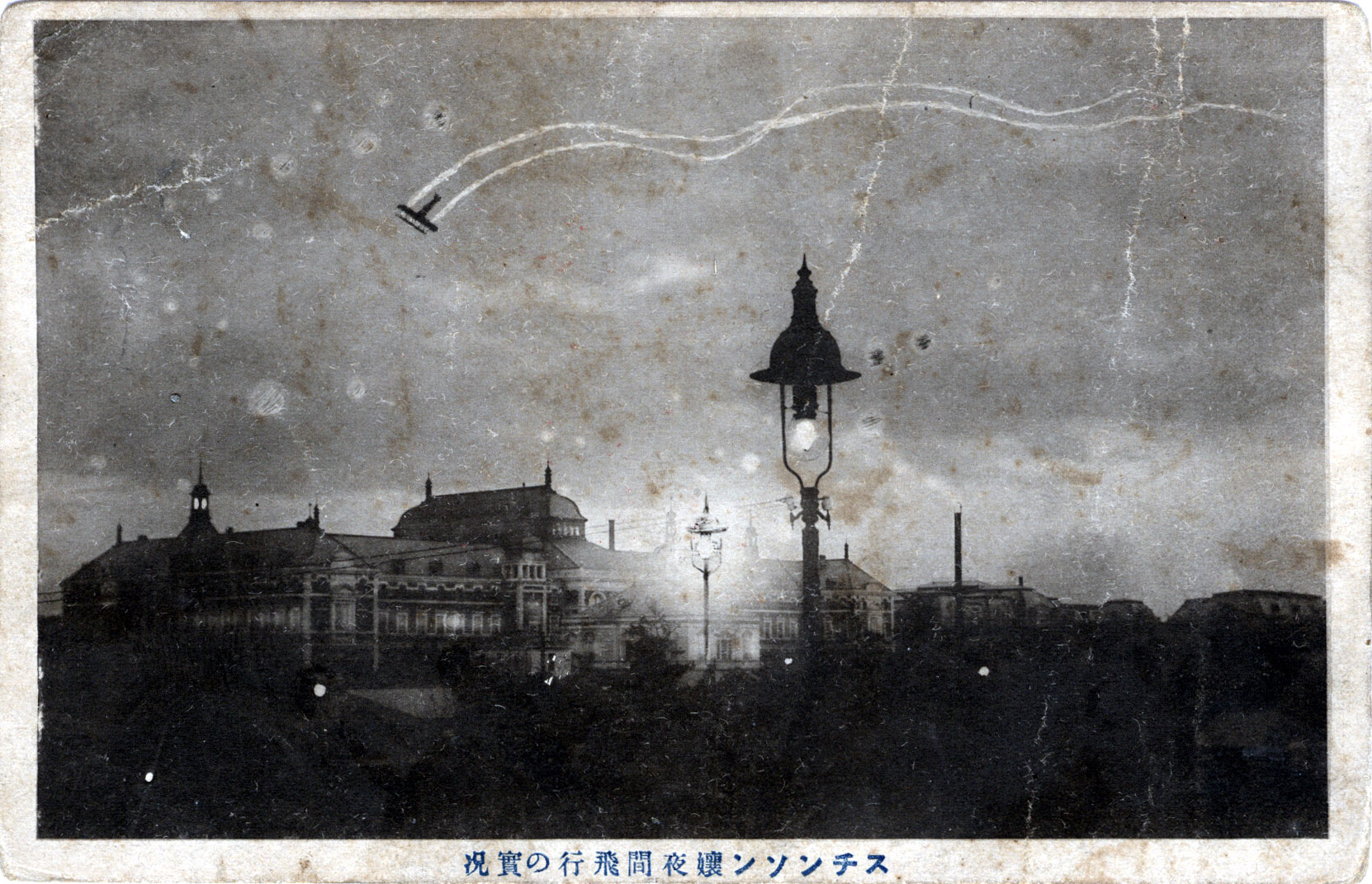 Katherine Stinson performs a nighttime barrel roll over the Kasumigaseki government district, Tokyo, 1916. Stinson is reported to have performed no fewer than six loops and was, according to some observers, garbed in Japanese kimono while barnstorming.