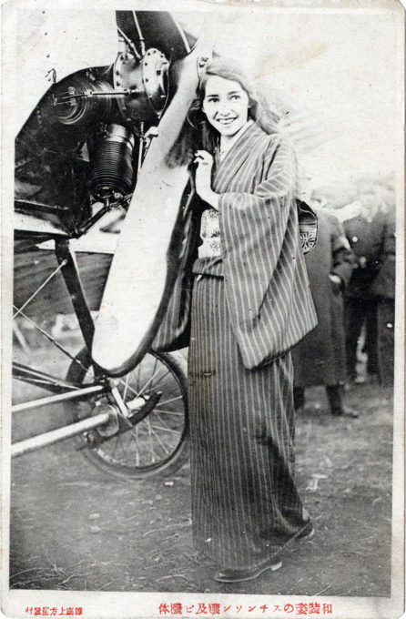 Aviatrix Katherine Stinson, “The Air Queen” and “Flying Schoolgirl”, in Japan, 1916. Stinson would make two visits to Japan … in December 1916 and again in September 1917. The “Flying Schoolgirl” was not all show. She was the first woman to fly solo at night, the first pilot (male or female) to perform skywriting, the first woman to fly for the U.S. Postal Service and, in December 1917, she set the American record for long-distance flying – 606 miles from San Diego to San Francisco. Stinson later broke her own record with a 783-mile flight from Chicago to New York.
