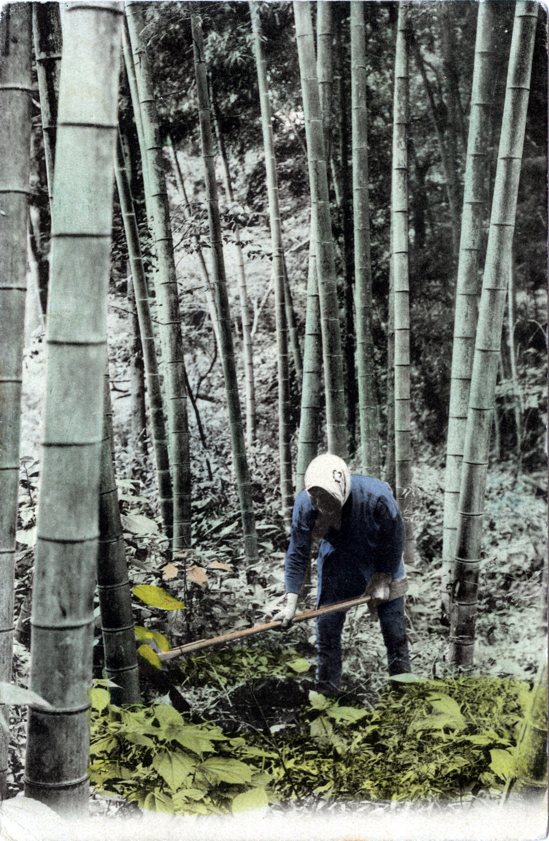 Bamboo-cutter harvesting young shoots in a bamboo grove, c. 1910. Correspondence on the reverse of this postcard reads: “Dear Nance, You remember my fondness for bamboo no doubt. We have bamboo sprouts to eat here, also lily roots and other delicate dishes. It is awfully hot and Dorothy is getting tan. I’ll write a letter soon, really. Adela.”