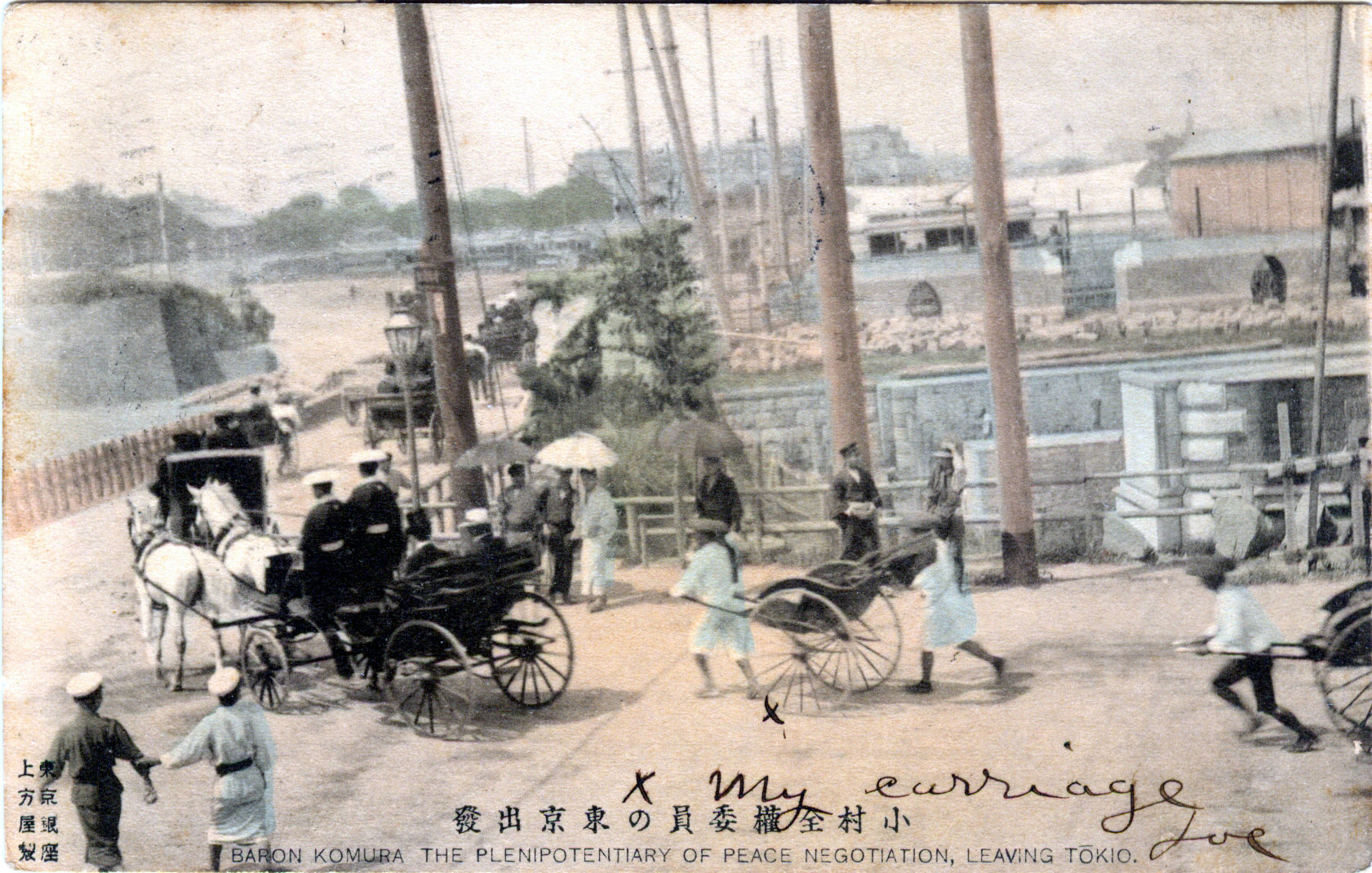 Whoever “Joe” is, he marks the first jinrikisha after the horses “my carriage”. There is no explanation provided. Baron Komura was the Foreign Minister, and former Supreme Court justice, representing Japan at peace negotiations with Russia hosted by US President Theodore Roosevelt to end the Russo-Japanese War (1904-05).