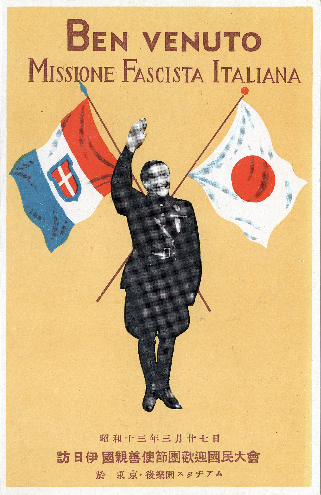 “Ben venuto”, Missione Fascista Italia (Italian Fascist Mission) Goodwill Tour of Japan advertising postcard, Tokyo, 1938. A delegation of 22 Italian government Fascists embarked on a one-month goodwill mission to Japan and Manchukuo in March 1938, headlining a national convention for Japanese adherents at Korakuen Stadium in Tokyo on March 27. Fascism never developed into a mass movement in Japan; unlike Italy or Germany, there wasn’t any cult of a supreme leader (emperor-worshipping notwithstanding). Instead, it took the form of an expansionist military dictatorship placing a heavy stress on agrarianism and a central role for military officers in national control.