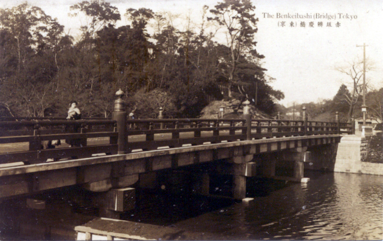 Benkeibashi spanned the moat protecting the Fukiage approach into the Edo Castle (and, later, the Imperial Palace) grounds from Akasaka Mitsuke. Fukiage comprised the western area of the castle grounds made into a firebreak after the great Meireki fire of 1657. (A 10-acre section of the grounds was also turned into a garden, now within the grounds of the New Otani hotel.) The bridge as seen in these images was constructed in 1889. Sadly, as with Nihonbashi, an elevated expressway now almost completely obscures from aerial view the present-day Benkeibashi.
