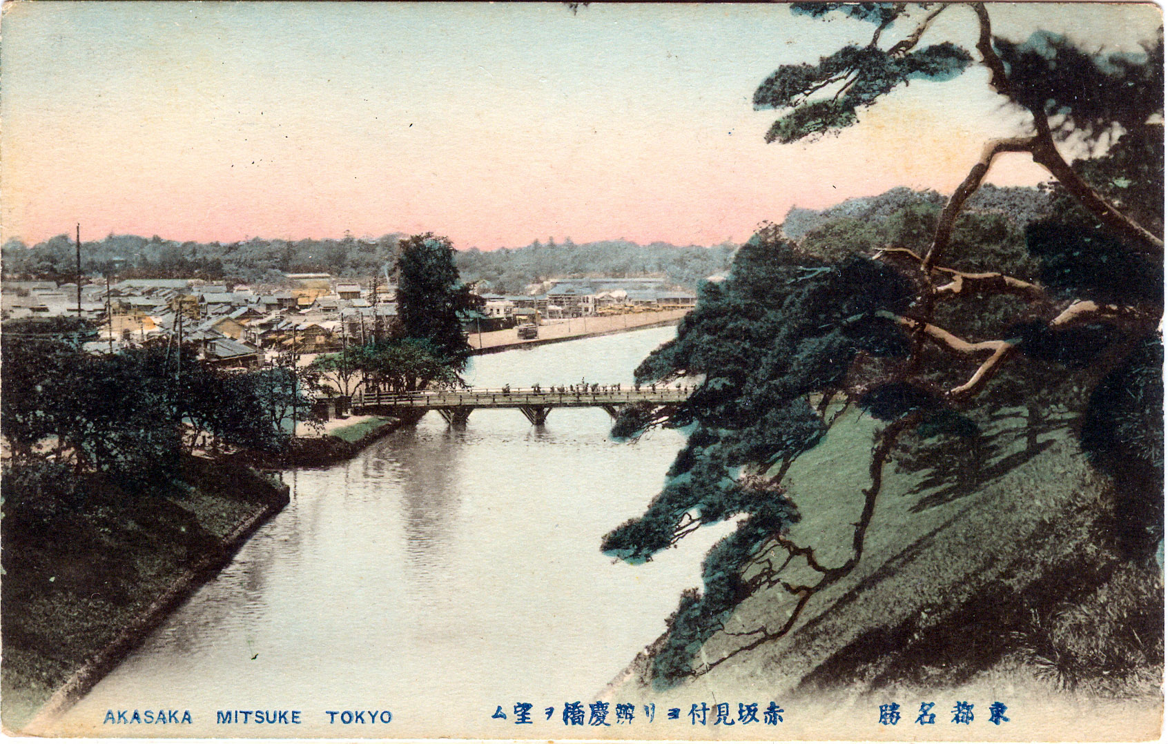 Benkeibashi, with the restaurants and tea houses of Akasaka Mitsuke in the distance, Tokyo, c. 1910.