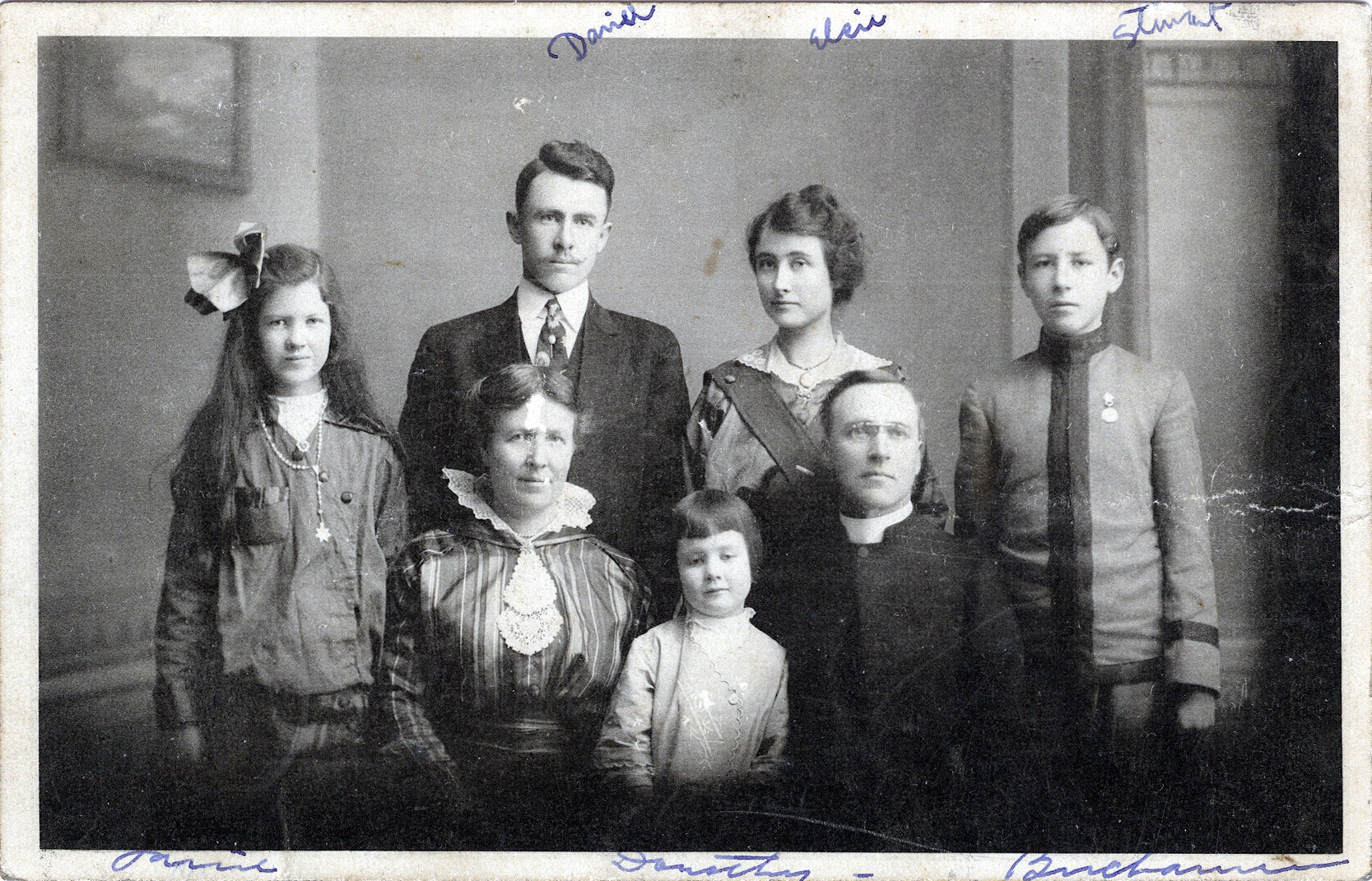 Buchanan family portrait, Christmas/New Year’s postcard, c. 1915. Seated in front (l-r): Janie, Minnie (wife), Dorothy, William; 2nd row (l-r): Daniel, Elizabeth (Elsie), Stuart. The family patriarch, William, served as a Presbyterian minister in Japan for over 40 years, in Takamatsu, Nagoya, Gifu, and Kobe. William and Minnie’s eldest child, Daniel, followed in his father’s footsteps, also becoming a Presbyterian missionary to Japan, teaching in Japanese high schools and universities and publishing a number of books translating Japanese haiku, proverbs and popular sayings into English that remain in print today.