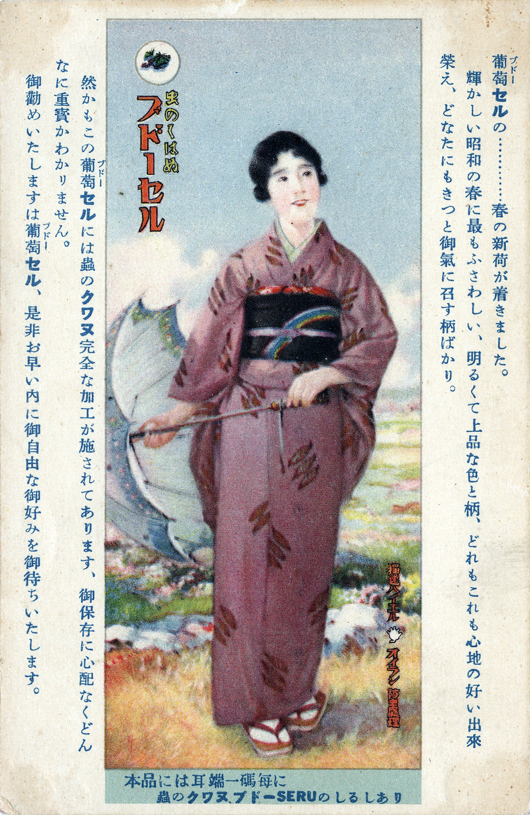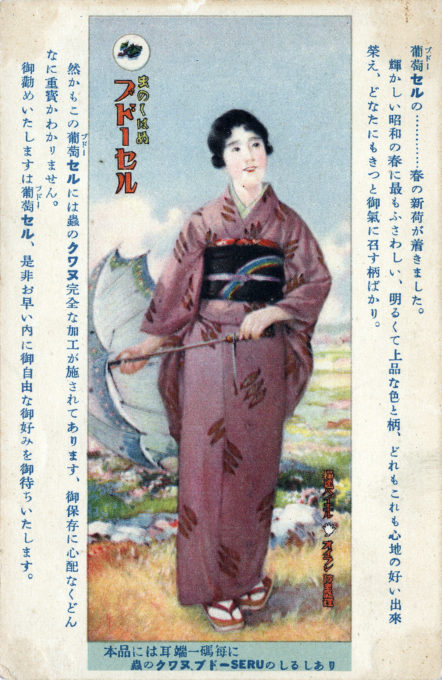 “Budō-Seru” (Grape-Cell) silk fabric advertising postcard, c. 1930. “Each roll of this fabric bears the ‘Insect-Proof Grape-Cell’ mark at every yard along the edge.”