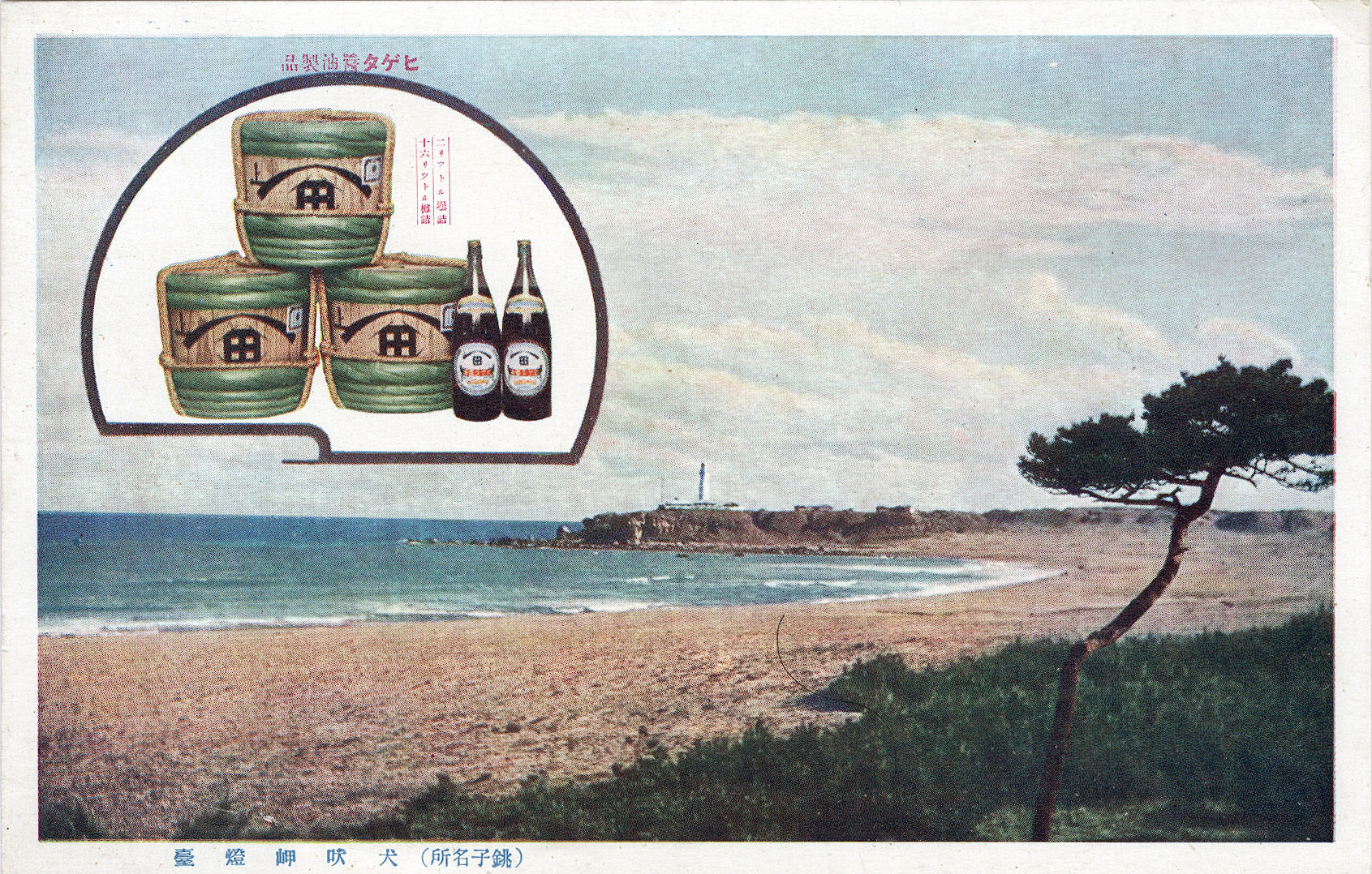Cape Inubosaki lighthouse, Choshi, Chiba Prefecture, Higeta Shoyu Co. advertising postcard, c. 1930. Higeta Shoyu was founded in 1616 in Chiba, Japan, the oldest shoyu brewery in the Kanto region. In 1900, Higeta was appointed as the official soy sauce of the Imperial Family. The inset image displays Higeta shoyu packaged in 2-liter bottles and 16-liter casks (komodaru).