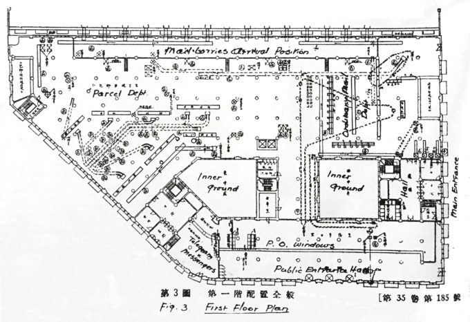 “The handling rooms are so arranged that foreign mail is handled on the third floor, general mail on the western side of the first and second floors, parcel post on the eastern side of the same floors, and the south-eastern corner of the third floor is allotted for the distribution of parcel post. The basement is for common use as well as for the repair, wash and tidying-up of mail bags, whilst the fourth floor is mainly used for business offices and the fifth floor for watchmen’s rooms, dressing rooms, and bed rooms.”